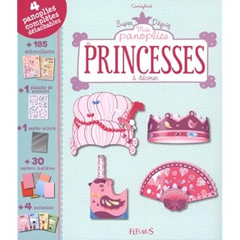 Retrouvez 4 panoplies complètes de princesses à décorer qui proposent chacune une coiffe, un éventail, un sac à main, une couronne et une planche de bijoux. Tout est prévu pour créer et habiller les accessoires : des papiers matières, des pochoirs, des autocollants et du papier miroir. En plus, 4 jolies pochettes permettent à l'enfant de ranger ses panoplies ou de permettre à ses copines de repartir avec !