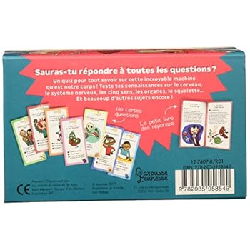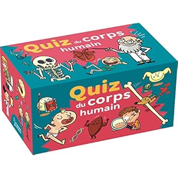 Un quiz très pratique à emporter partout, pour s’amuser entre copains ou en famille, et apprendre une mine d’informations sur le corps humain et tous ses secrets ! Une boîte avec 100 cartes questions et un livret de réponses. Les cartes sont réparties en 7 thèmes et séparées dans la boîte au moyen d'intercalaires. Les questions sont ouvertes ou à propositions. Pour chaque réponse, le livret propose un complément d'informations. En début de livret, les règles du Quiz sont exposées.